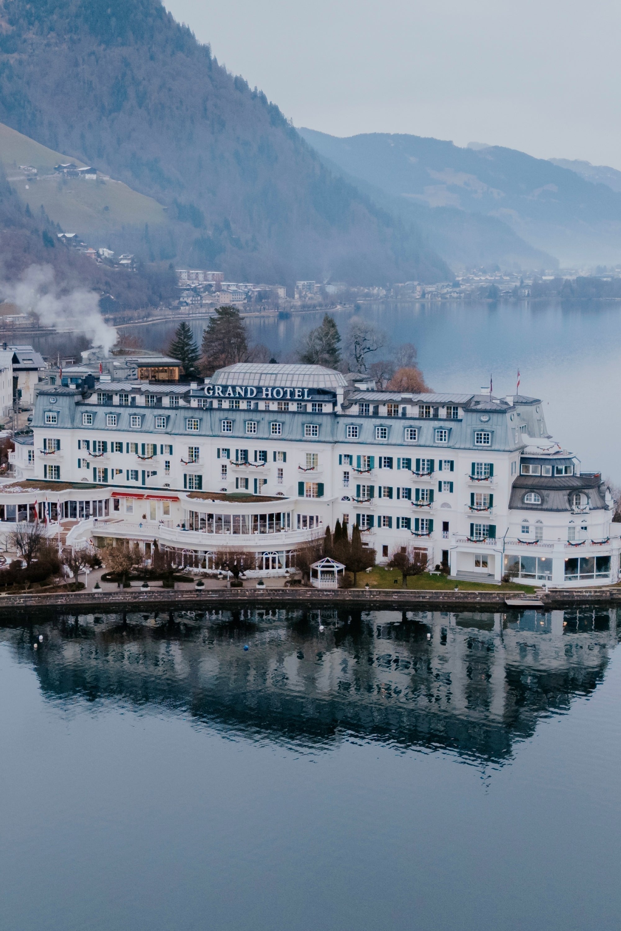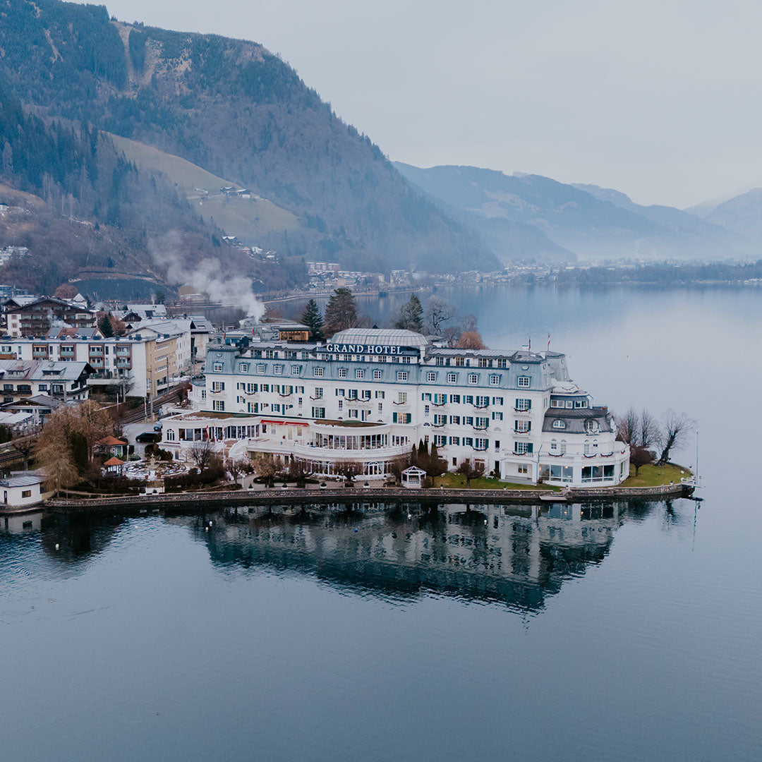 Next, we headed to Zell am See to check into one of the most beautiful hotels we’ve ever seen. The Grand Hotel Zell am See sits right on the edge of a vast lake, perfectly reflecting the surrounding panoramic mountain landscape.