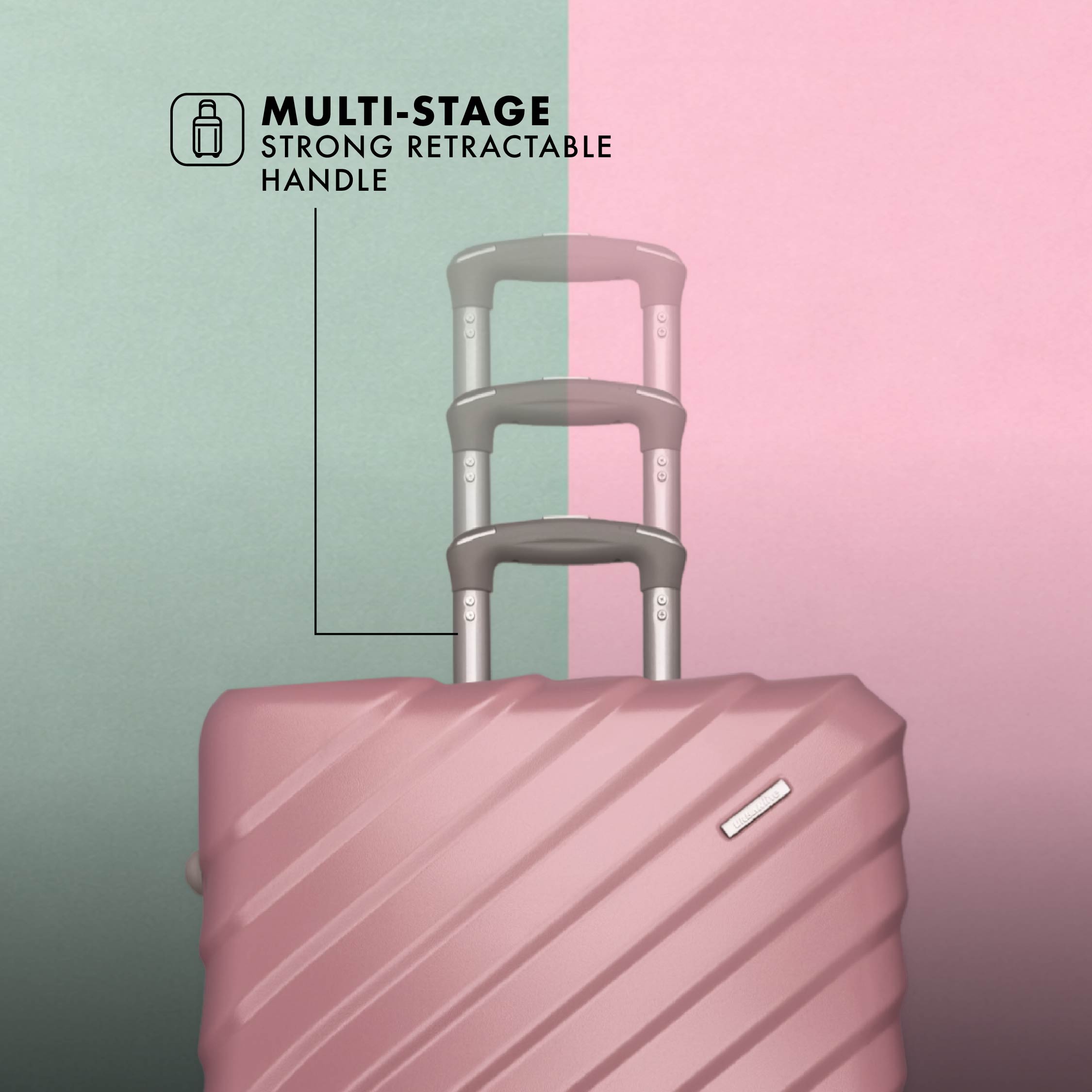 Internal push-button telescopic trolley handle system with multi-stage locking heights, making even heavy cases much easier to manoeuvre.